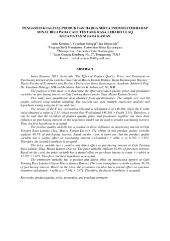 Kusuma, Indra and Palinggi, Yonathan and Johansyah, Johansyah (2025) Pengaruh Kualitas Produk Dan Harga Serta Promosi Terhadap Minat Beli Pada Cafe Tentang Rasa Lebaho Ulaq Kecamatan Muara Kaman Kabupaten Kutai Kartanegara. Program Studi Manajemen.