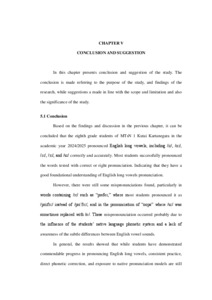 Based on this background, the problem of this study is formulated as: "How do the eighth grade students of MTsN 1 Kutai Kartanegara in academic year 2024/2025 pronounce English vowels?" In line with this, the purpose of this study is “To know how the eighth grade students of MTsN 1 Kutai Kartanegara in academic year 2024/2025 pronounce English Vowels.”